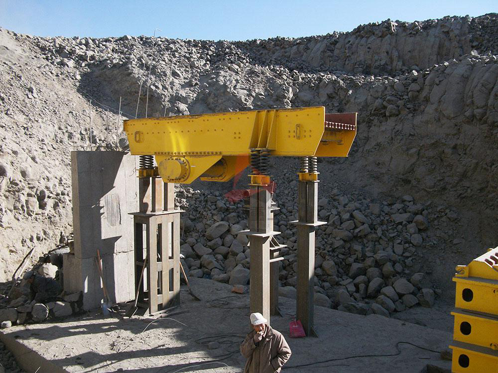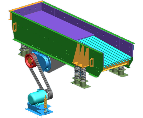The ZSW series vibrating feeder is composed of the feeding chute body, exciter, spring support, transmission device, etc. The vibration source of the chute body for vibrating feeding is the exciter. The exciter is composed of two eccentric shafts (driving and driven) and a gear pair. The motor drives the driving shaft through a V-belt, and then the gear on the driving shaft engages to rotate the driven shaft. The driving and driven shafts rotate in opposite directions simultaneously, causing the chute body to vibrate, enabling the continuous flow of materials and achieving the purpose of conveying materials.